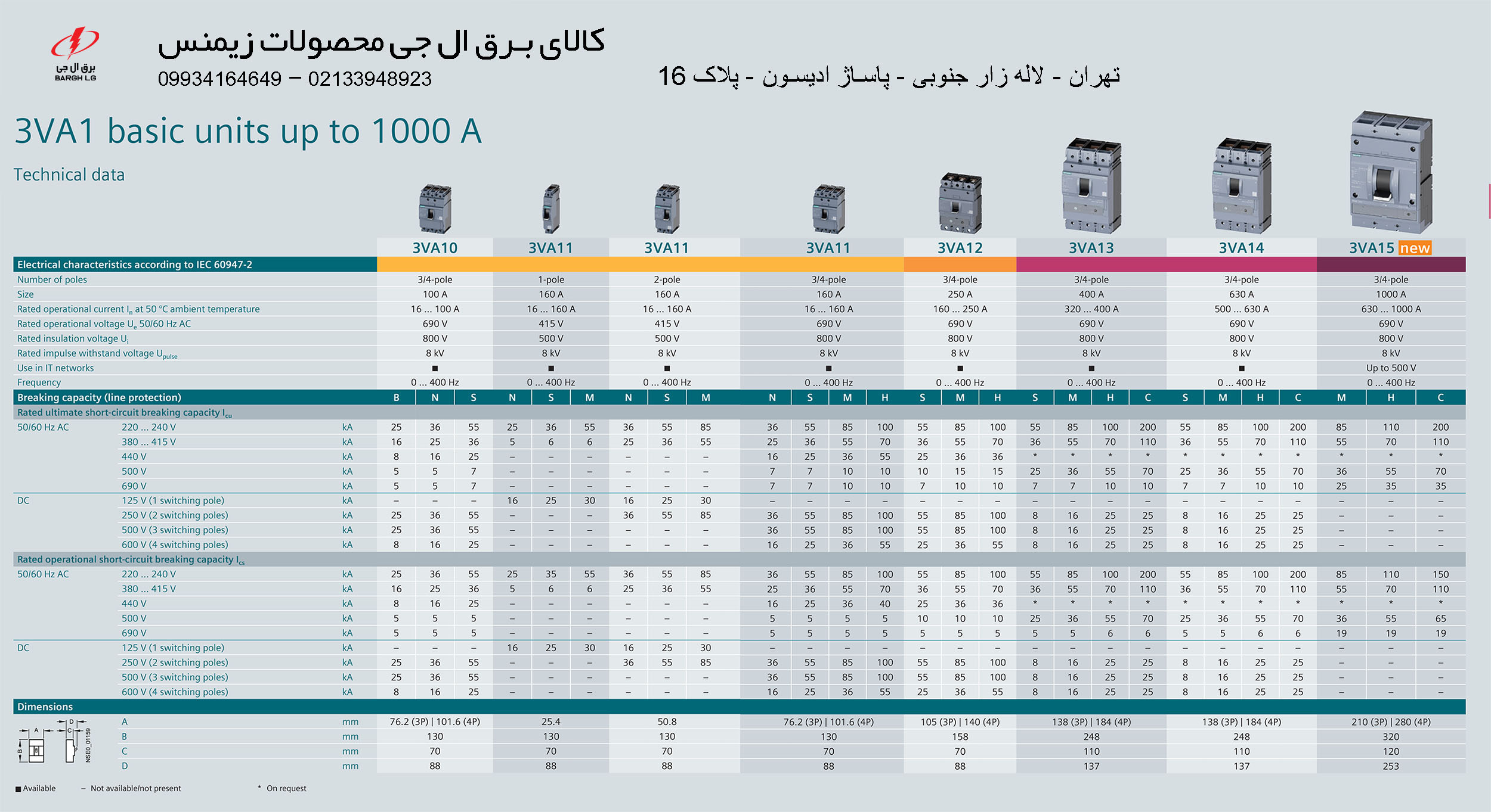 6. قابلیت استفاده در ولتاژ های AC/DC: مدل 3VA1 برای استفاده در شبکههای سه فاز، شبکههای AC و ولتاژ DC مناسب است.