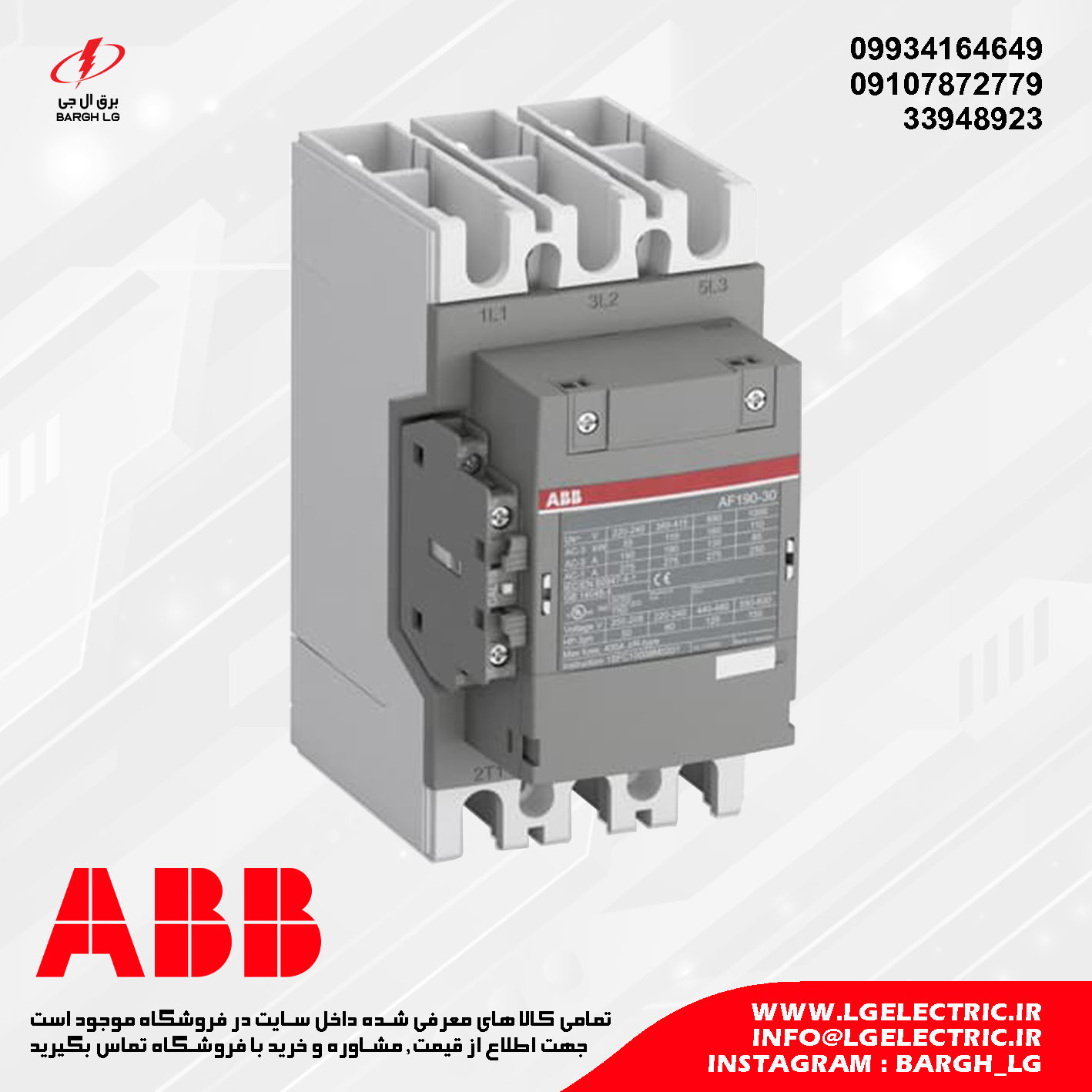 برق ال جی نمایندگی رسمی کنتاکتور های ABB در ایران بوده و آماده ارائه خدمات مشاوره و فروش کنتاکتور ABB می باشد. جهت مشاوره و خرید کنتاکتور ABB با برق ال جی تماس حاصل نمایید. ما به عنوان وارد کننده انحصاری محصولات ABB، کنتاکتور های این برند را به قیمت دست اول بازار برق ایران (لاله زار تهران) عرضه میکنیم. تمامی محصولات ABB ارائه شده توسط ال جی الکتریک دارای ضمانت اصالت و سلامت کالا به همراه 24 ماه گارانتی و 7 سال خدمات پس از فروش میباشند. پس با خیال راحت میتوانید کنتاکتور های با کیفیت ABB را تهیه کرده و در پروژه های خود استفاده کنید.