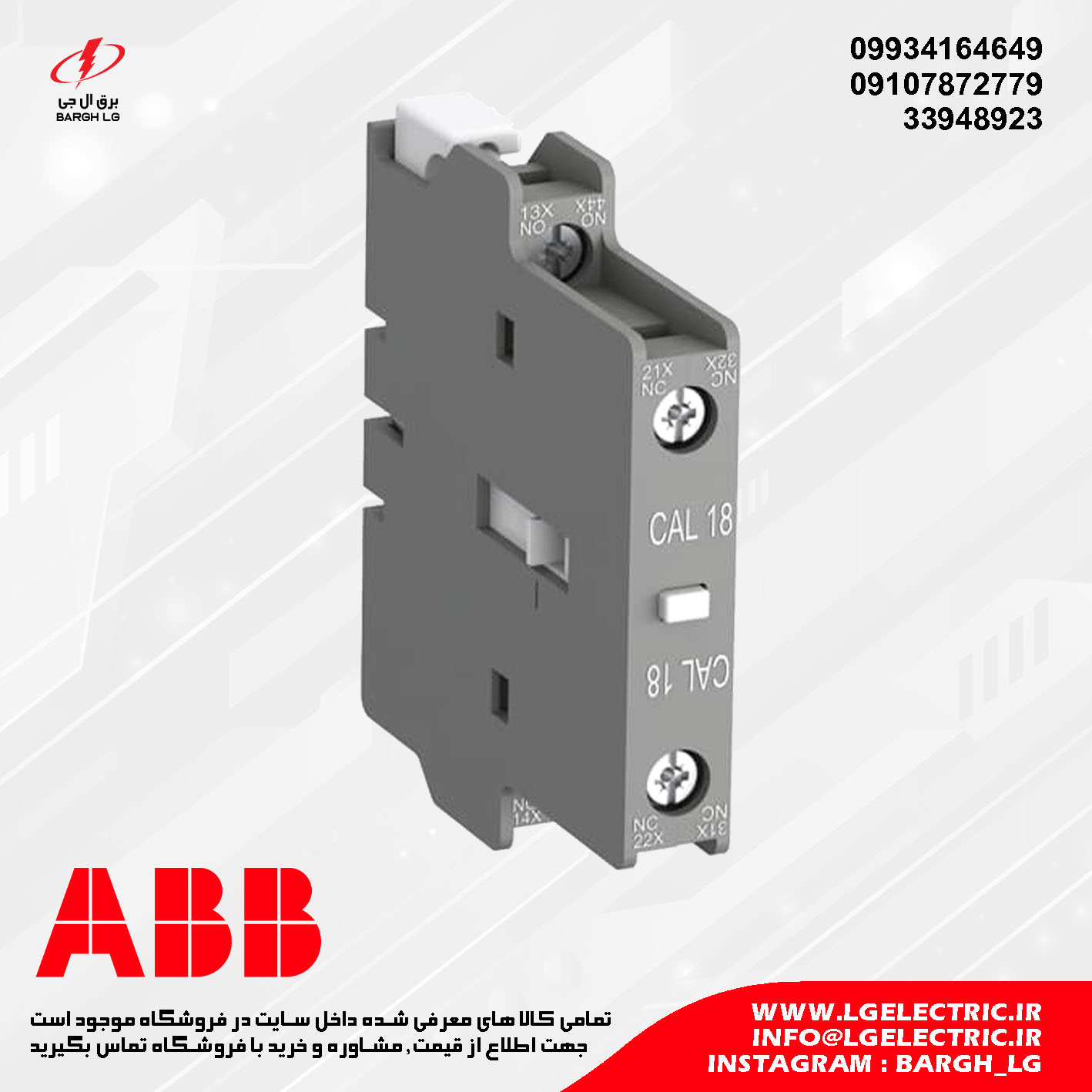 برق ال جی نمایندگی رسمی کنتاکت کمکی کنتاکتور های برند ABB در ایران بوده و آماده ارائه خدمات مشاوره و فروش کنتاکت کمکی کنتاکتور ABB سری CAL18 میباشد. جهت مشاوره و خرید کنتاکت کمکی کنتاکتور ABB با برق ال جی تماس حاصل نمایید.